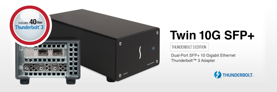 Sonnet’s Twin10G™ SFP+ 10GbE Thunderbolt™ 3 adapter is the powerfully simple solution for adding blazing-fast 10GbE network connectivity to any Mac® or Windows® computer with Thunderbolt 3 ports. Delivering up to ten times Gigabit Ethernet’s performance and supporting uses such as HD video editing on high-performance shared storage systems, it’s no wonder that 10GbE use has soared.