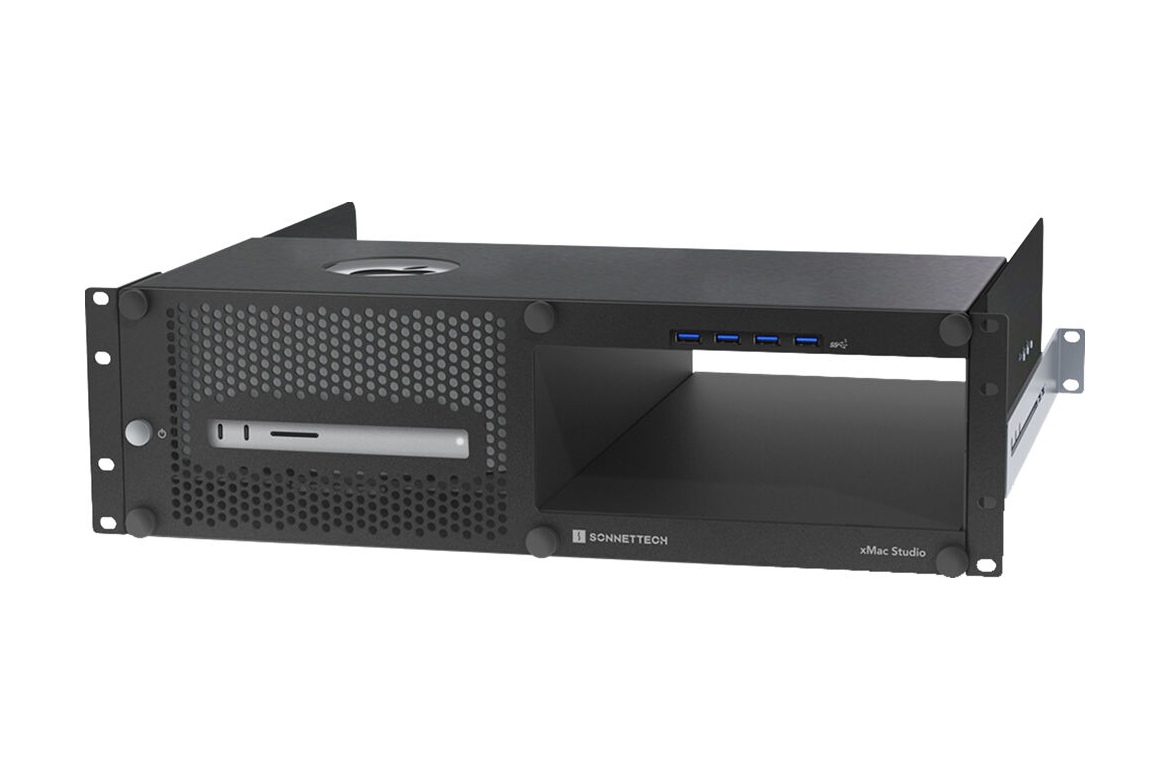 Easy Access to Mac Studio and PCIe Card Expansion ModulexMac Studio is a rugged steel 3U rackmount enclosure for securing a Mac Studio with optional PCIe card expansion module in a rack, placing the Mac Studio behind a quick and easy to remove front panel. Convenient front panel operation allows you turn Mac Studio on with its own dedicated front power button, connect USB devices through a 4-port USB-A hub, and access the computer’s front ports and SD card slots.