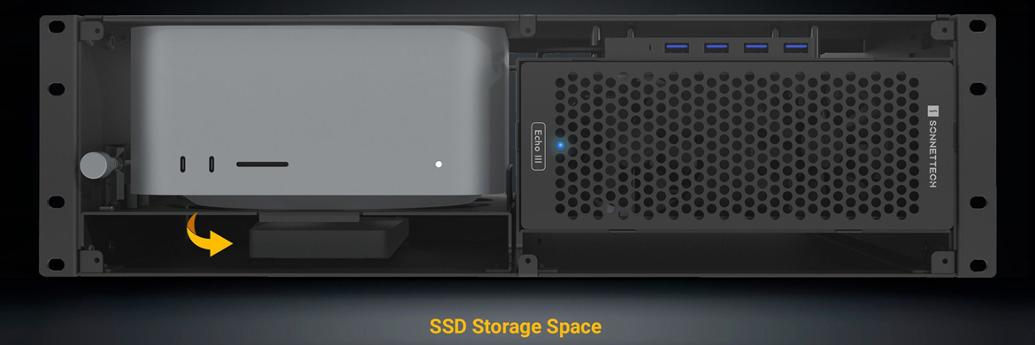 No tools required – removable front panel secured with thumbscrews allows easy installation of and access to the Mac Studio. Secured with three thumbscrews on the back, the Thunderbolt expansion module can be removed and reinstalled through the front of the enclosure without removing the front plate. - Space for Storage