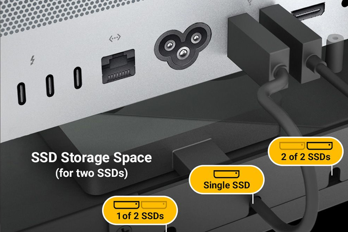 Behind a covered opening beneath the computer is a space to place two Thunderbolt or USB SSDs (sold separately); two included adhesive-backed magnets secure them in place. - Open Slot and Port Access