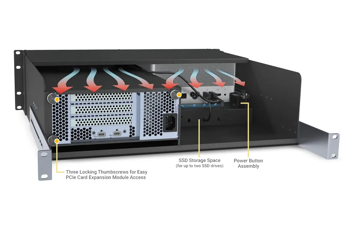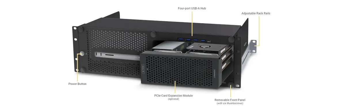 Easy Access to Mac Studio and PCIe Card Expansion ModulexMac Studio is a rugged steel 3U rackmount enclosure for securing a Mac Studio with optional PCIe card expansion module in a rack, placing the Mac Studio behind a quick and easy to remove front panel. Convenient front panel operation allows you turn Mac Studio on with its own dedicated front power button, connect USB devices through a 4-port USB-A hub, and access the computer’s front ports and SD card slots.