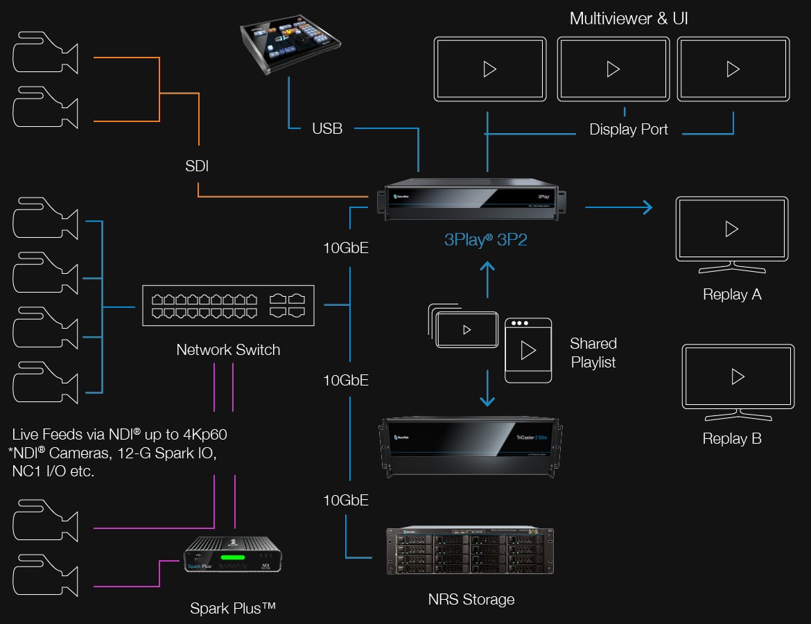 3Play® 3P2 is a 10-channel replay solution, offering and mix of 8 inputs via NDI®, 4 inputs of SDI, and 2 outputs of SDI or NDI®. In addition, a single quadlink SDI output is available for 2160p UHD output. 3Play 3P2 gives championship-level connection with any workflow.Shareable Playlist