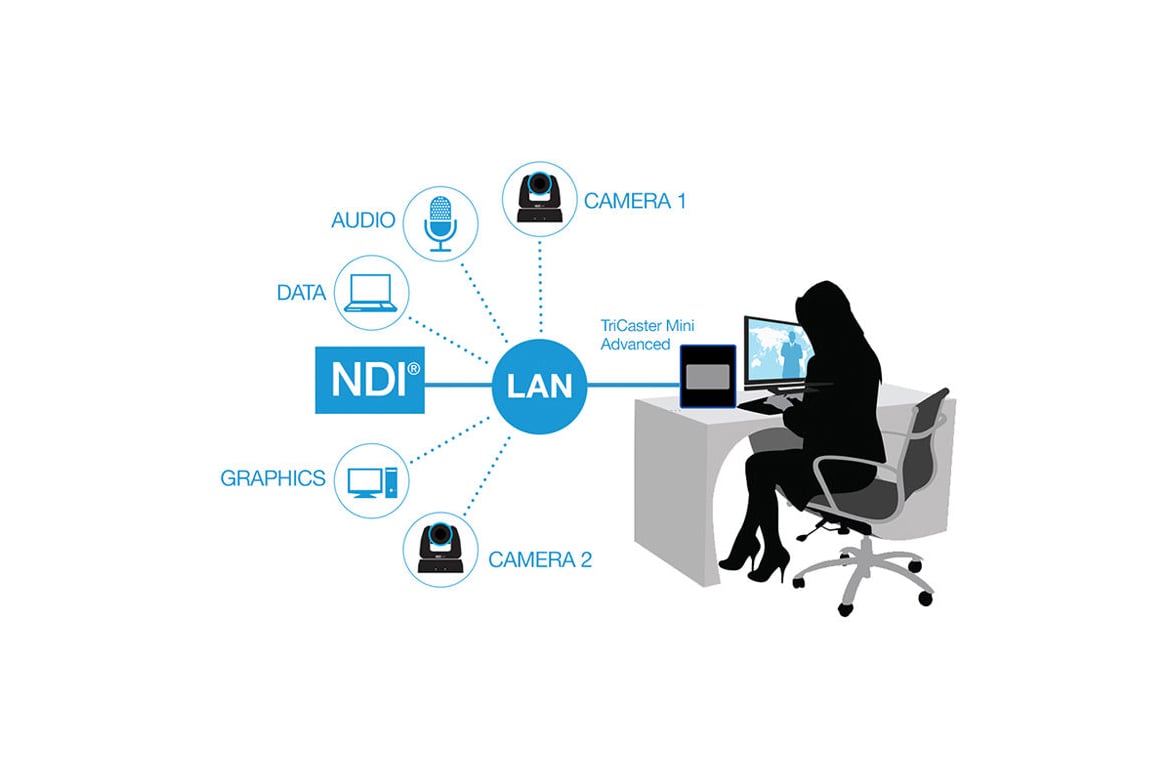 The Advanced TriCaster software built into the switcher provides compatibility with NewTek's NDI A/V protocol, as well as Audinate's Dante audio protocol (requires separate Dante Virtual Soundcard license). All available video and audio inputs can be utilized by network connectivity, allowing video and audio devices to exist on a standard IP network without the need for routing expensive and cumbersome video and audio cables.